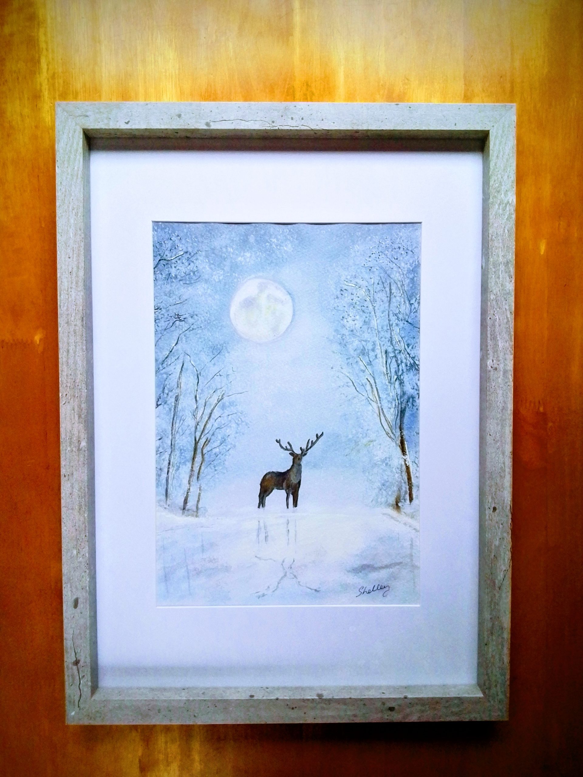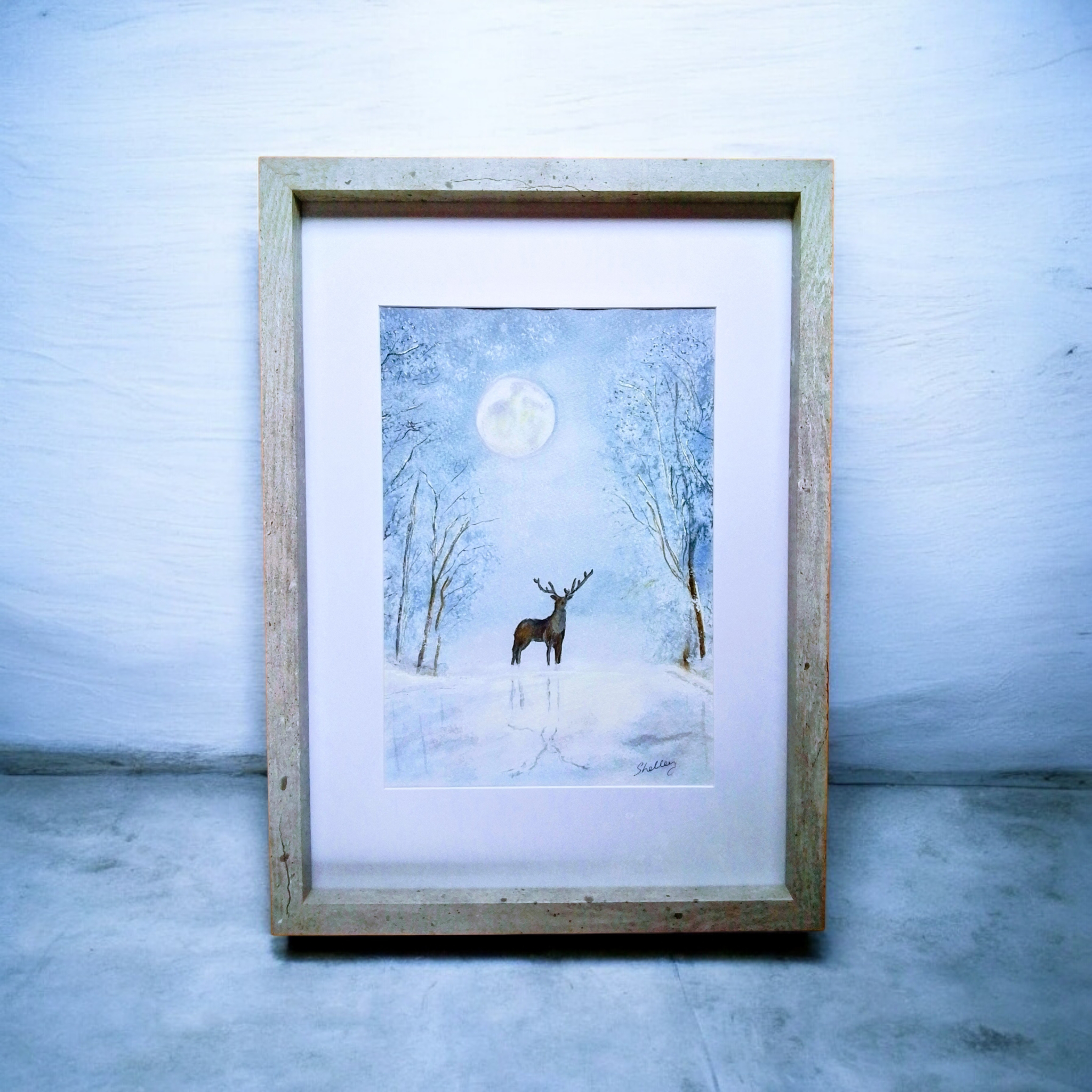 Original, hand painted watercolour of a Deer in a wintery, frosty snow scene in the moon light.