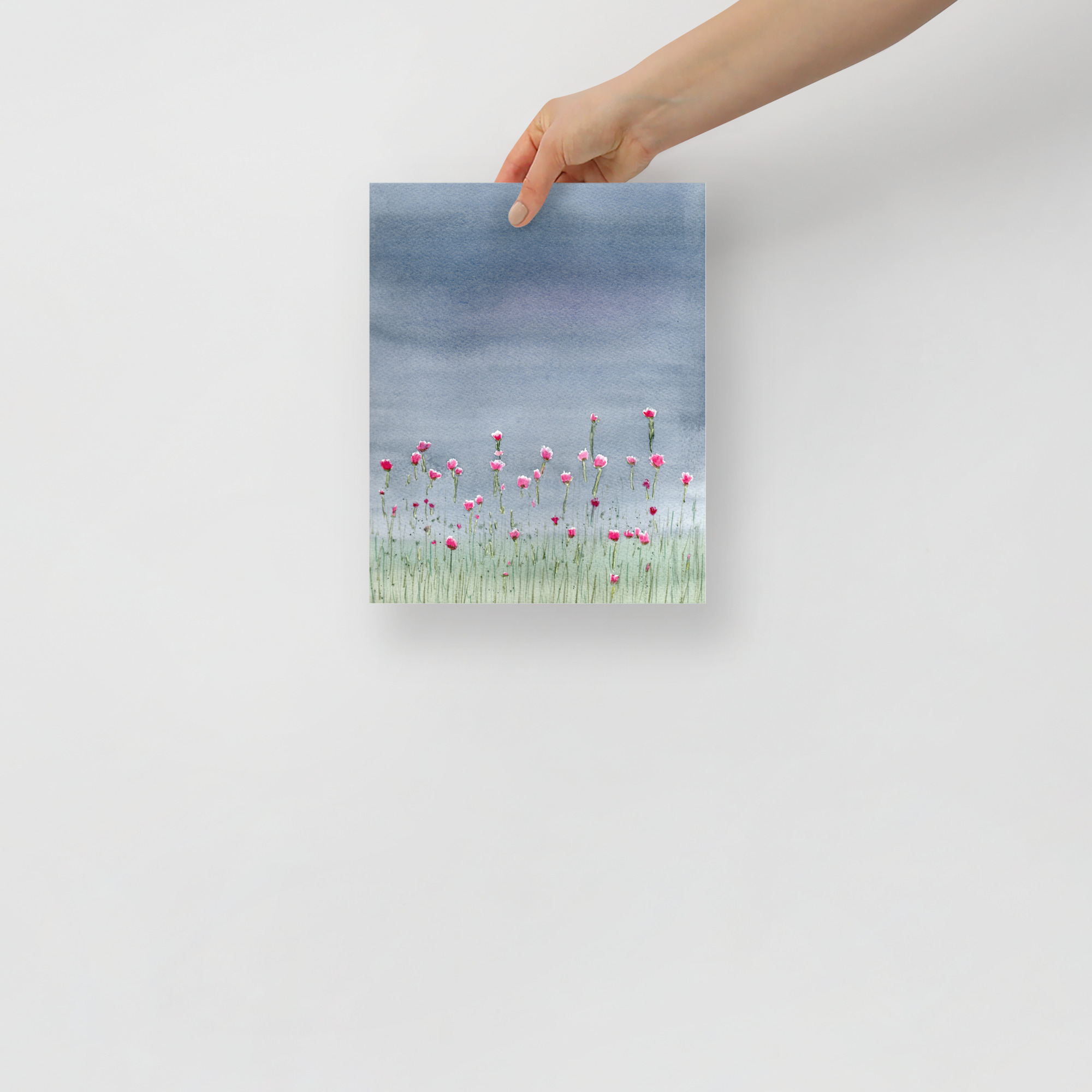 A beautifully simple watercolour turned into a print from my own original painting of a lovely pink flowers set in the English Countryside.